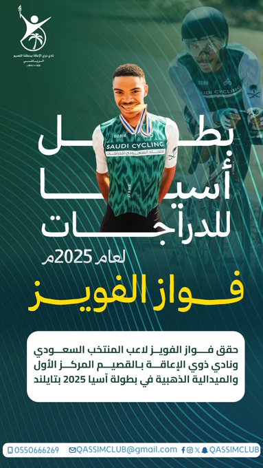 حقق فواز الفويز لاعب المنتخب السعودي ونادي ذوي الإعاقة بـ #القصيم المركز الأول والميدالية الذهبية في بطولة آسيا 2025 بمدينة ناخون راتشاسيما التايلندية.