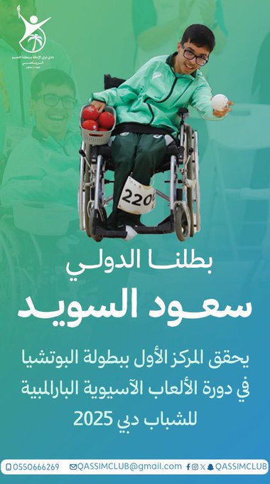 بطلنا الدولي سعود السويد يحقق المركز الأول ببطولة البوتشياclubqassim@gmail.comديسمبر 14, 2025اخبار النادي بطلنا الدولي سعود السويد يحقق المركز الأول ببطولة البوتشيا في دورة الألعاب الآسيوية البارالمبية للشباب #دبي2025 شارك clubqassim@gmail.com المقالات: 146 المقالة السابقة بطلنا الدولي سعود السويد يحصد المركز الأول ببطولة البوتشيا المقالة التالية الفويز يتوج بالميدالية الفضية في سباق 100م (T72) اترك ردّاًإلغاء الردلن يتم نشر عنوان بريدك الإلكتروني. الحقول الإلزامية مشار إليها بـ * الاسم * البريد الإلكتروني * الموقع أضف تعليقًا * احفظ اسمي، بريدي الإلكتروني، والموقع الإلكتروني في هذا المتصفح لاستخدامها المرة المقبلة في تعليقي.إرسال التعليق