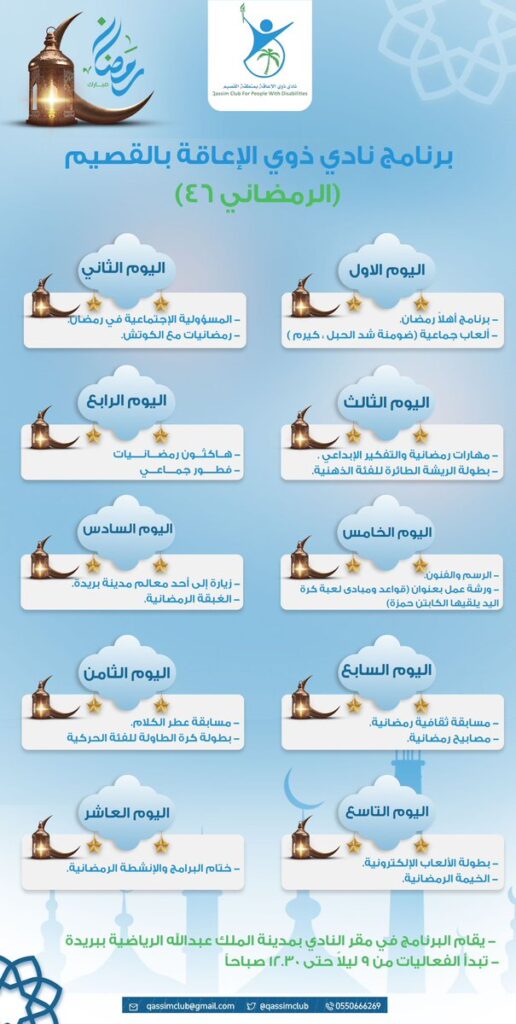 برنامج نادي ذوي الإعاقة بالقصيم (الرمضاني 46)clubqassim@gmail.comفبراير 28, 2025اخبار النادي إليكم برنامج نادي ذوي الإعاقة بالقصيم (الرمضاني 46) حياكم الله شارك clubqassim@gmail.com المقالات: 146 المقالة السابقة استقبال رئيس مجلس إدارة الاتحاد السعودي للإعاقات البصرية المقالة التالية إنجازات الفريق النسائي في نادي ذوي الإعاقة بـالقصيم اترك ردّاًإلغاء الردلن يتم نشر عنوان بريدك الإلكتروني. الحقول الإلزامية مشار إليها بـ * الاسم * البريد الإلكتروني * الموقع أضف تعليقًا * احفظ اسمي، بريدي الإلكتروني، والموقع الإلكتروني في هذا المتصفح لاستخدامها المرة المقبلة في تعليقي.إرسال التعليق